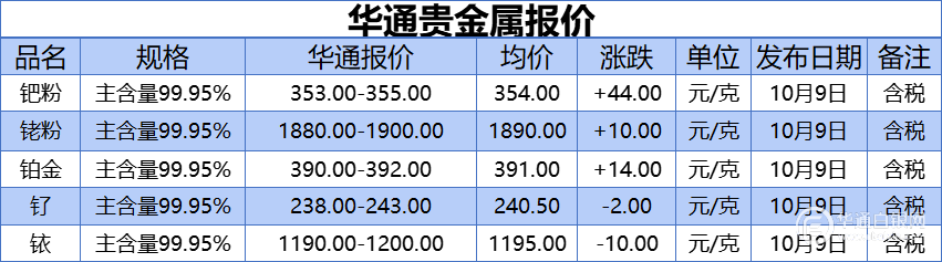 华通白银网 10月9日讯:钯粉、铑粉、铂金、钌、铱报价