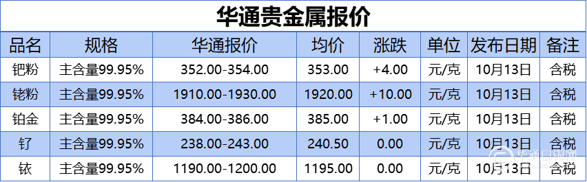 华通白银网 10月13日讯:钯粉、铑粉、铂金、钌、铱报价