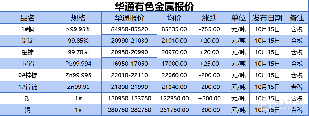 华通白银网 10月15日讯:1#铜、铝锭(99.85%)、铝锭(99.70%)、1#铅、1#锌、0#锌、镍、锡报价