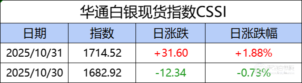 华通白银现货指数CSSI走势日报,今日指数1714.52,日涨跌+31.60,日涨跌幅+1.88%