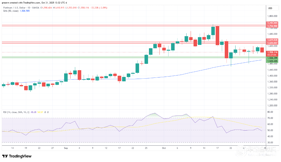 如果铂金跌破1550美元,则将测试1520-1530美元支撑位。