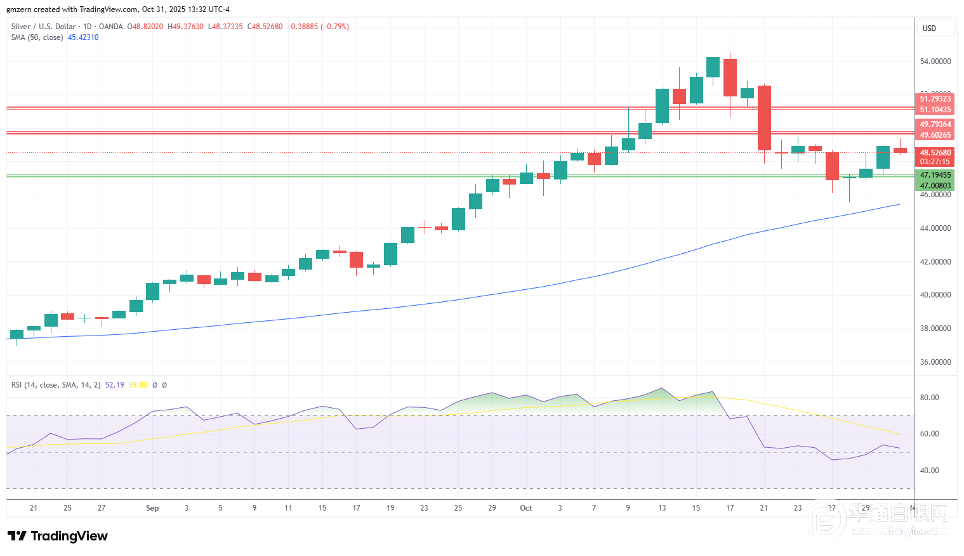 获利了结背景下,白银正失去动力,未能手语49.60-49.80美元的阻力位上方,并回落至48.50美元水平。