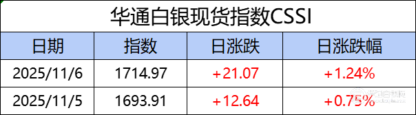 华通白银现货指数CSSI走势日报,今日指数1714.97,日涨跌+21.07,日涨跌幅+1.24%