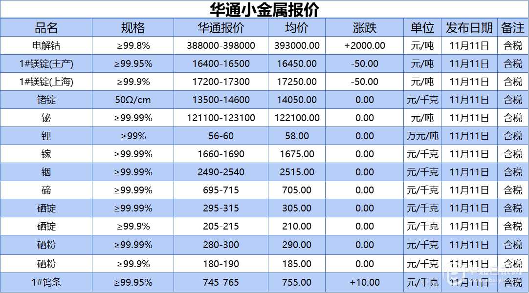 华通白银网 11月11日讯:电解钴、1#镁锭(生产)、1#镁锭(上海)、锗锭、铋、锂、镓、铟、碲、硒锭(99.99%)、硒锭(99.9%)、硒粉、硒粉(99.9%)、1#钨条报价