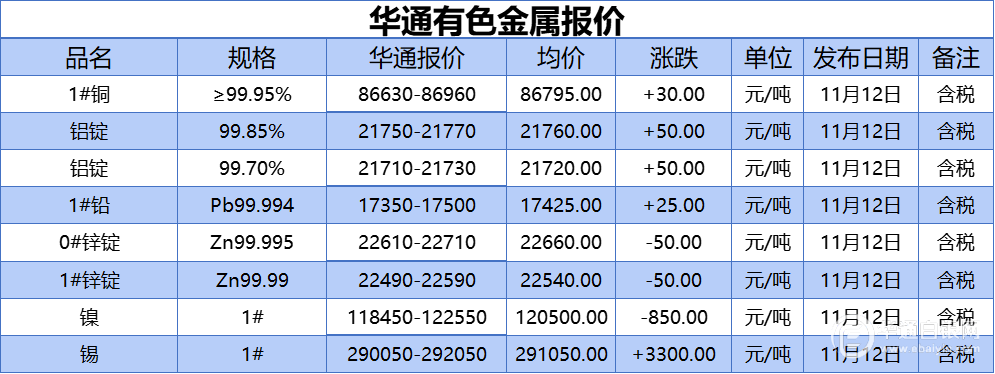 华通白银网 11月12日讯:1#铜、铝锭(99.85%)、铝锭(99.70%)、1#铅、1#锌、0#锌、镍、锡报价