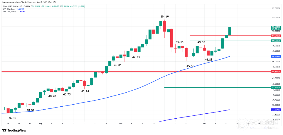 【华通白银网11月13日讯】•白银突破51.07美元,多头目前瞄准未来几个交易日的多年高点54.49美元。