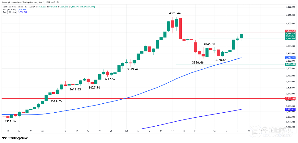 黄金的稳定表现继续支撑着贵金属市场的人气。现货黄金在50日移动均线切入位3914.61美元上方盘整,关键阻力位位于4192.36美元。如果持续突破该水平,可能会推动金价向10月份的高点4381.44美元上涨。
