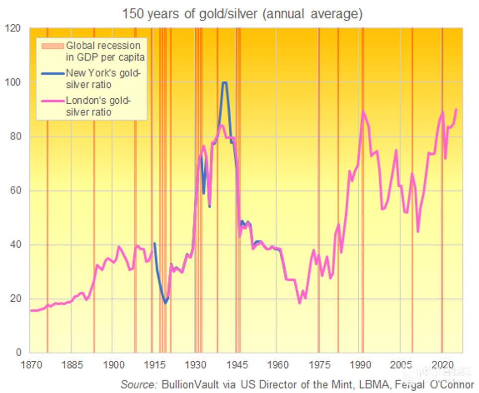 到目前为止,金银比在2025年创下了除二战之外的最高年度水平,超过了1991年和2020年全球经济衰退期间的平均90。