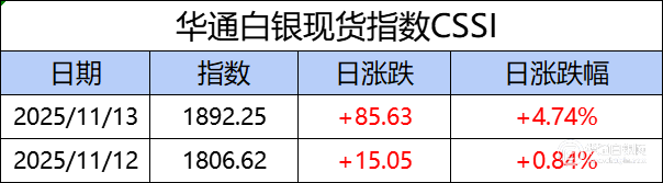 华通白银现货指数CSSI走势日报,今日指数1892.25,日涨跌+85.63,日涨跌幅+4.74%