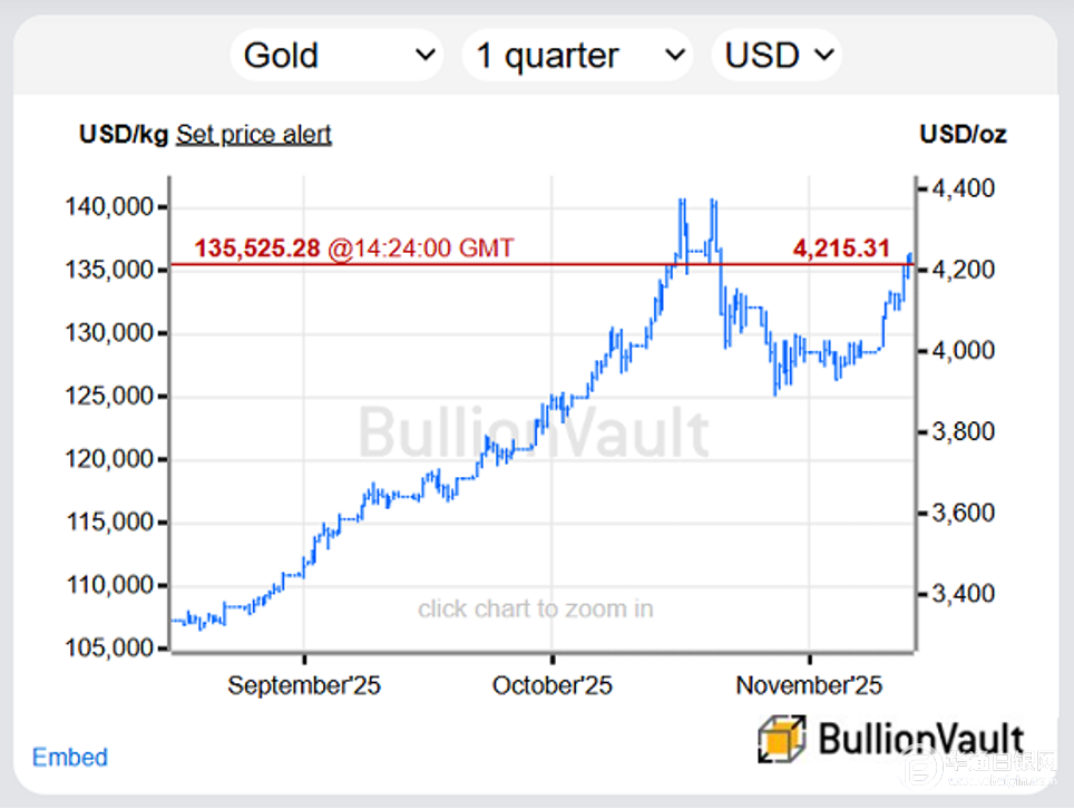 本周到目前为止,金价已经上涨了4.6%,当日又上涨了2.4%,回到4200美元/盎司以上,这是10月中旬创下的黄金价格历史新高,仅用了5个交易日就突破了这一水平。