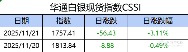 华通白银现货指数CSSI走势日报,今日指数1757.41,日涨跌-56.43,日涨跌幅-3.11%