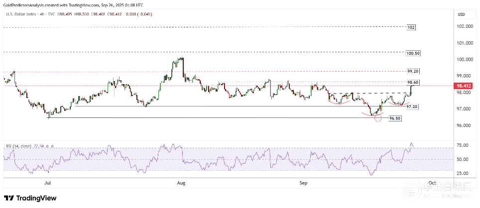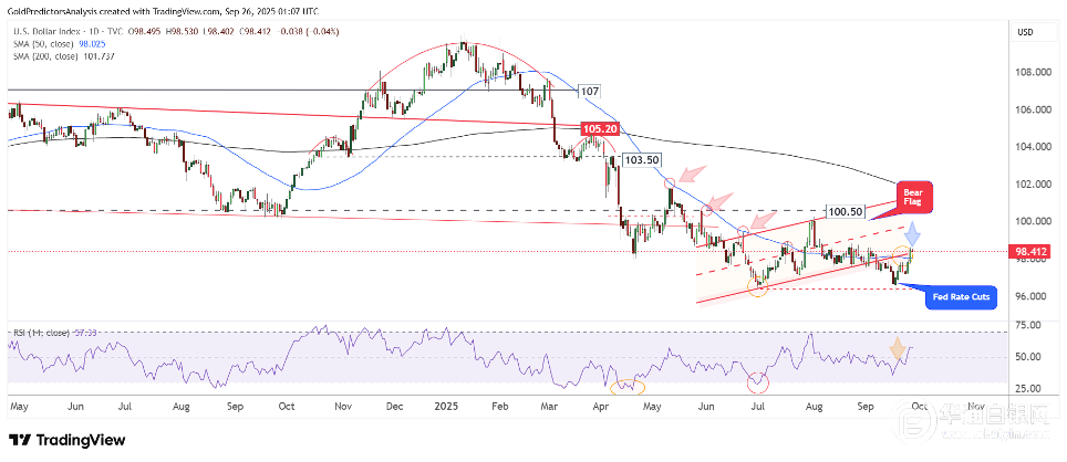 美元指数日走势图显示,在美联储降息后,美元指数已从96.50开始强劲反弹。目前正接近98.60阻力位。这一阻力标志着看跌旗形形态的上边界,并暗示着突破98.60可能会延伸至100.50水平。