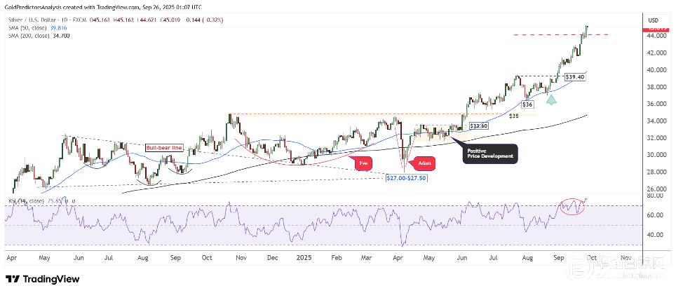 现货白银日线图显示,银价已突破44美元水平,进入45美元区域。整体价格走势仍然看涨,表明未来将进一步上涨。