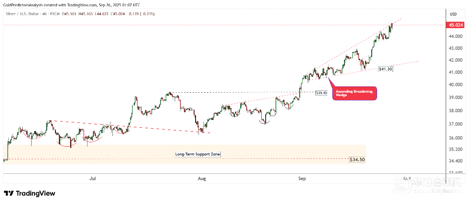 现货白银4小时图显示,银价在45美元附近的上升楔形形态顶部达到了强劲阻力位。尽管存在阻力,但银价仍持稳,显示小幅回调迹象,在纪录高位附近盘整。