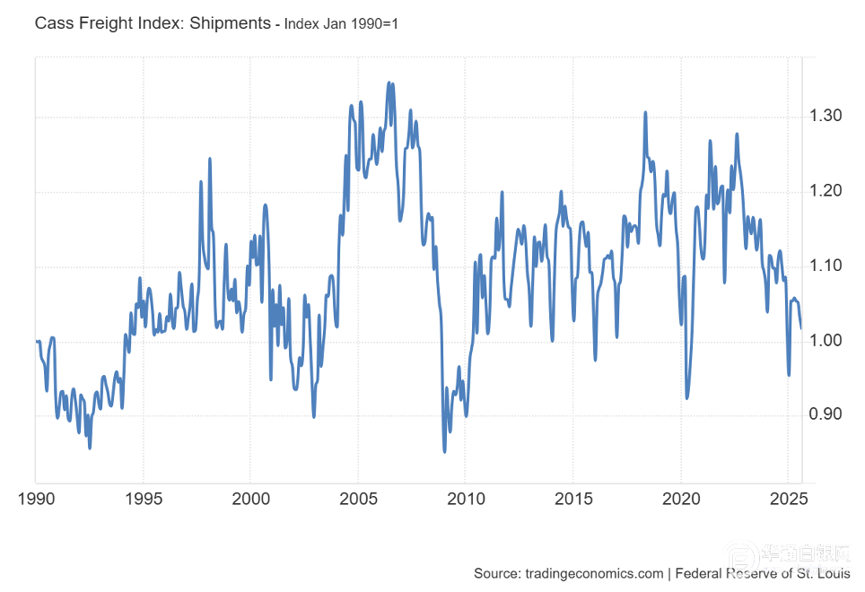 【华通白银网9月26日讯】卡斯货运指数(Cass Freight Index)在2025年8月跌至1.017,为过去10年的最低水平之一。由于整个制造业和零售业的需求疲软,货运量继续下降。