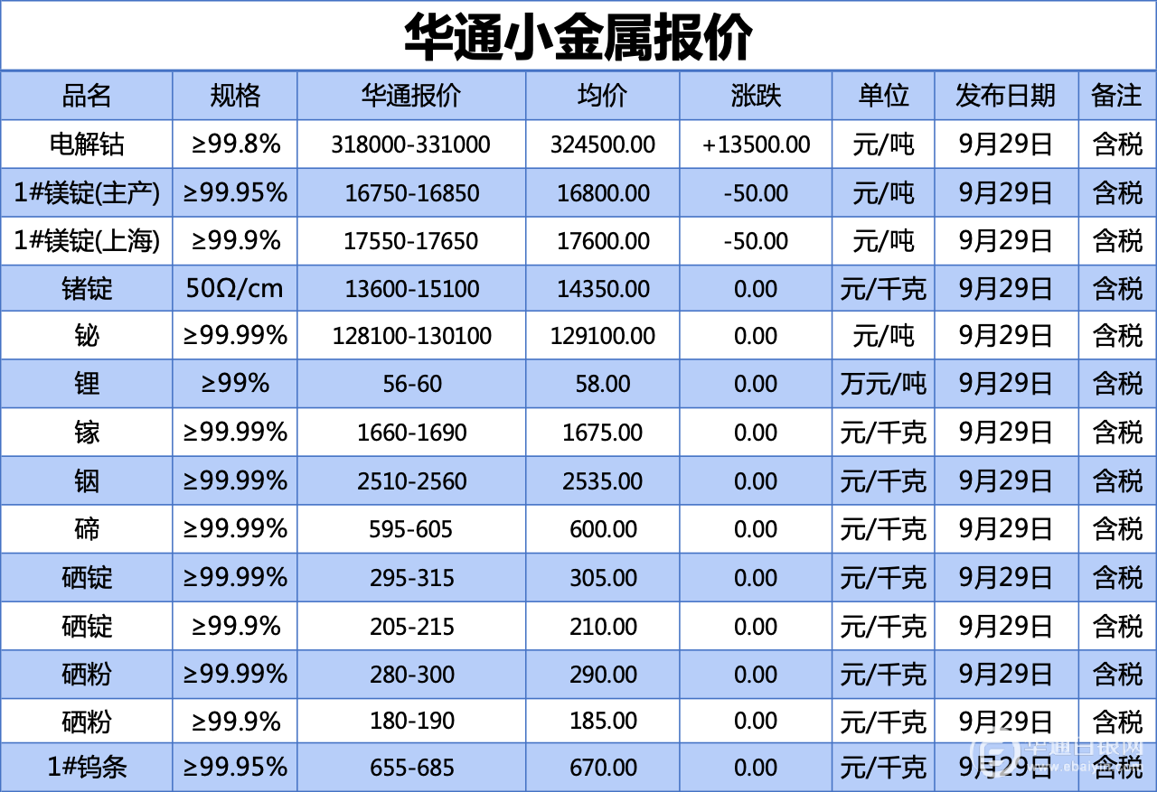 华通白银网 9月29日讯:电解钴、1#镁锭(生产)、1#镁锭(上海)、锗锭、铋、锂、镓、铟、碲、硒锭(99.99%)、硒锭(99.9%)、硒粉、硒粉(99.9%)、1#钨条报价