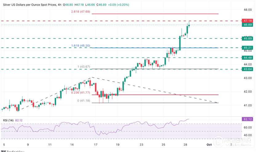 白银向上,日内高点在47.20美元左右,可能会提供一些阻力。上面,斐波那契工具显示9月中旬看涨运行的261.8%,为47.70美元。