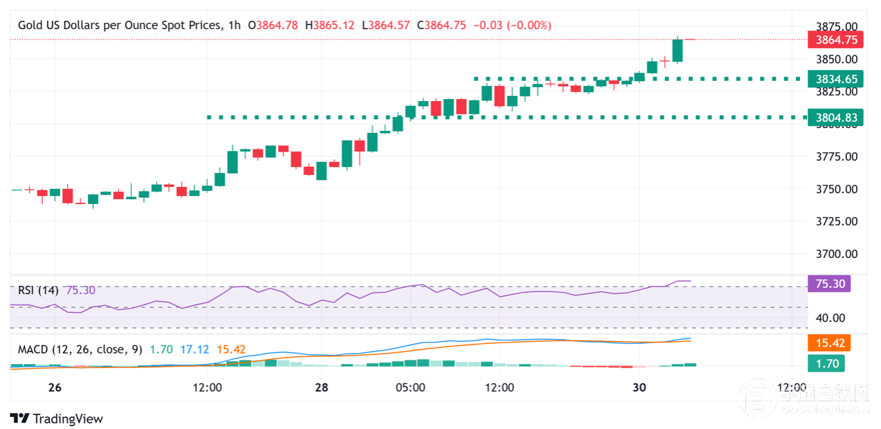 黄金连续第四天获得正牵引力,并在周二的亚洲交易日继续创下新高。贵金属在过去一小时内攀升至3,870美元,似乎准备在支持性的基本背景下延长其既定的上升趋势。在地缘政治紧张局势升级的背景下,美国政府可能关闭的风险支撑着对避风港金条的需求。此外,美国联邦储备委员会(Fed)对进一步降息的赌注进一步推动了向不屈服的黄金的流动。