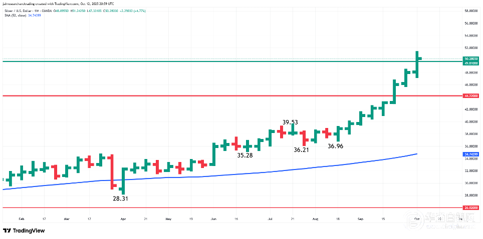 白银连续第二周上涨,白银收于50.28美元,上涨2.29美元,涨幅4.77%。银价轻松超过49.81美元的长期上限,并守住了近10多年来的高点。多头仍然掌控市场,但由于市场情绪紧张,加上新闻头条不断,本轮涨势的下一回合将取决于本周的走势。