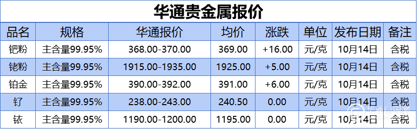 华通白银网 10月14日讯:钯粉、铑粉、铂金、钌、铱报价