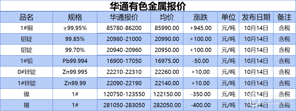华通白银网 10月14日讯:1#铜、铝锭(99.85%)、铝锭(99.70%)、1#铅、1#锌、0#锌、镍、锡报价