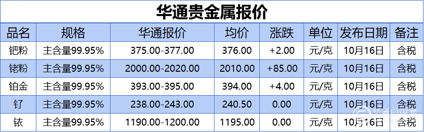 华通白银网 10月16日讯:钯粉、铑粉、铂金、钌、铱报价