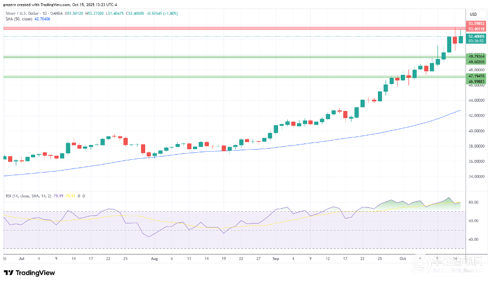 银价再次尝试收于阻力位53.40-53.60美元上方,但失去了动力,并从日高回落。