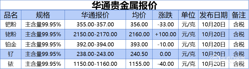 华通白银网 10月20日讯:钯粉、铑粉、铂金、钌、铱报价