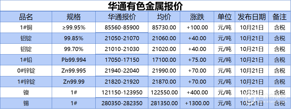 华通白银网 10月21日讯:1#铜、铝锭(99.85%)、铝锭(99.70%)、1#铅、1#锌、0#锌、镍、锡报价