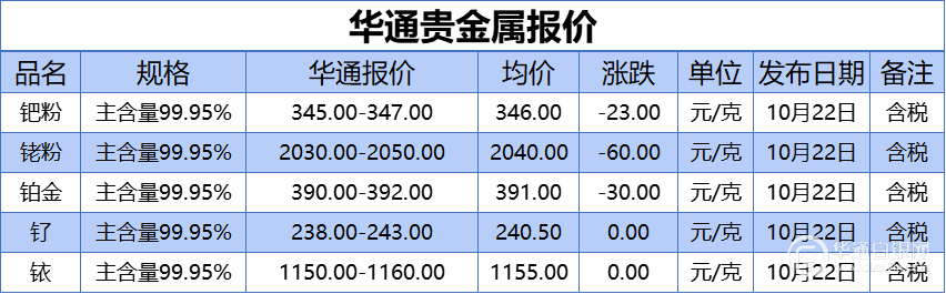 华通白银网 10月22日讯:钯粉、铑粉、铂金、钌、铱报价