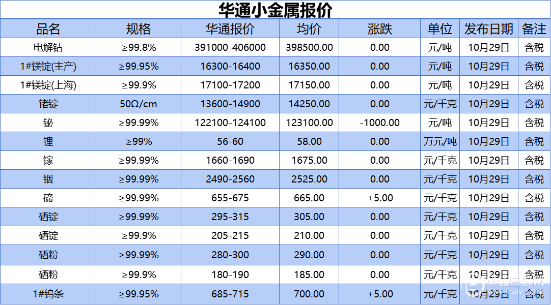 华通白银网 10月29日讯:电解钴、1#镁锭(生产)、1#镁锭(上海)、锗锭、铋、锂、镓、铟、碲、硒锭(99.99%)、硒锭(99.9%)、硒粉、硒粉(99.9%)、1#钨条报价