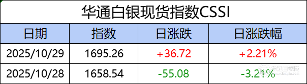 华通白银现货指数CSSI走势日报,今日指数1695.26,日涨跌+36.72,日涨跌幅+2.21%