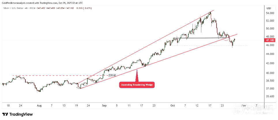 现货白银的4小时走势图也显示,银价已跌破47.60美元的支撑位。这个支撑位标志着上升扩散楔形的底部。跌破该支撑位后,银价从45.80美元的强力支撑位反弹,与趋势线(黑色虚线)一致。