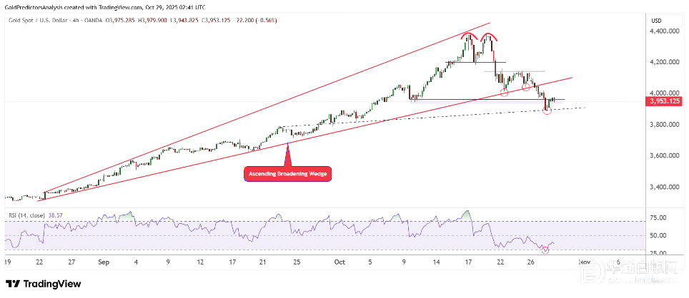 现货金4小时走势图显示,金价已跌破4000美元的支撑位。这个支撑先前是上升的扩散楔形模式的下边界。突破后,它触及了3900美元支撑位附近的趋势线(黑色虚线),并开始向4000美元区域反弹。