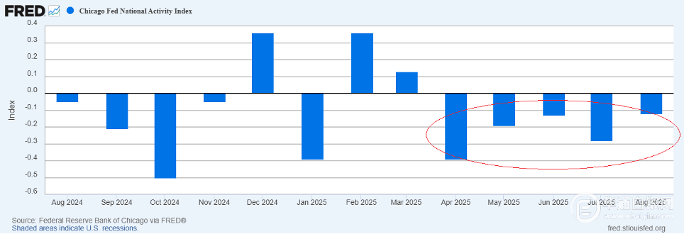 【华通白银网10月29日讯】芝加哥联储全国活动指数自2025年4月以来一直为负。这种负面趋势表明美国经济产出持续疲软。这种持续的低迷反映了更广泛的经济减速,尽管有关股市和贸易的头条新闻都很乐观。