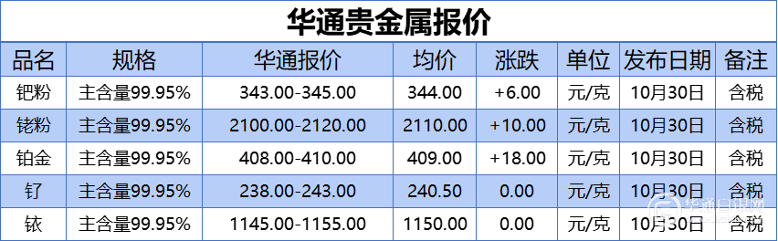 华通白银网 10月30日讯:钯粉、铑粉、铂金、钌、铱报价