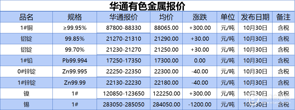 华通白银网 10月30日讯:1#铜、铝锭(99.85%)、铝锭(99.70%)、1#铅、1#锌、0#锌、镍、锡报价