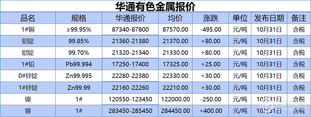 华通白银网 10月31日讯:1#铜、铝锭(99.85%)、铝锭(99.70%)、1#铅、1#锌、0#锌、镍、锡报价