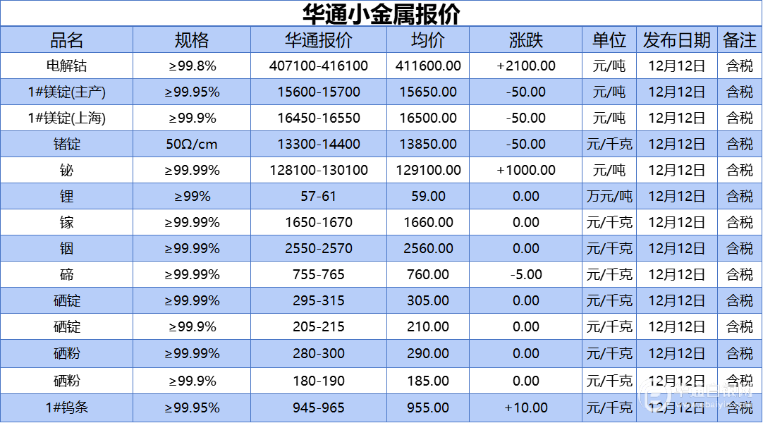 华通白银网 12月12日讯:电解、1#镁锭(生产)、1#镁锭(上海)、锗锭、铋、锂、镓、铟、碲、硒锭(99.99%)、硒锭(99.9%)、硒粉、硒粉(99.9%)、1#钨条报价