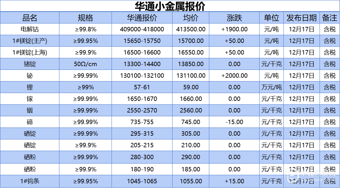 华通白银网 12月17日讯:电解钴、1#镁锭(生产)、1#镁锭(上海)、锗锭、铋、锂、镓、铟、碲、硒锭(99.99%)、硒锭(99.9%)、硒粉、硒粉(99.9%)、1#钨条报价