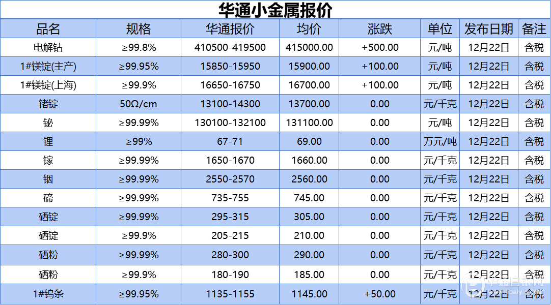 华通白银网 12月22日讯:电解钴、1#镁锭(生产)、1#镁锭(上海)、锗锭、铋、锂、镓、铟、碲、硒锭(99.99%)、硒锭(99.9%)、硒粉、硒粉(99.9%)、1#钨条报价