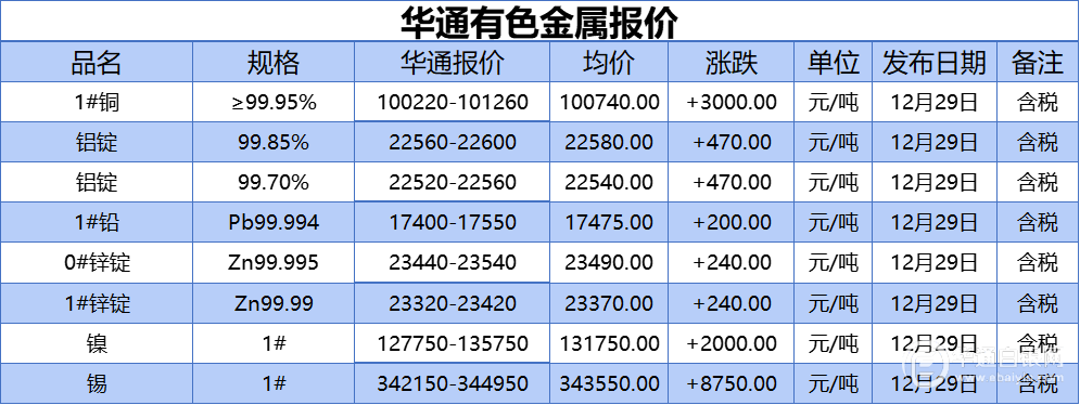 华通白银网 12月29日讯:1#铜、铝锭(99.85%)、铝锭(99.70%)、1#铅、1#锌、0#锌、镍、锡报价
