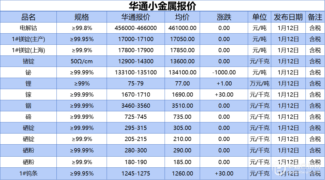华通白银网 1月12日讯:电解钴、1#镁锭(生产)、1#镁锭(上海)、锗锭、铋、锂、镓、铟、碲、硒锭(99.99%)、硒锭(99.9%)、硒粉、硒粉(99.9%)、1#钨条报价
