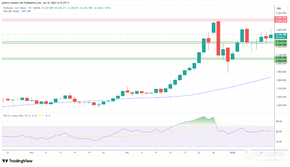 倘若铂金价格涨至2450美元以上,它将会向2510美元至2530美元的阻力位移动。