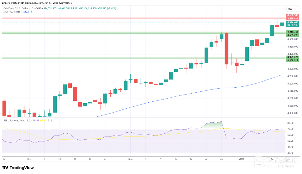 【华通白银网1月15日】•黄金试图稳定在4640-4650美元阻力位上方。