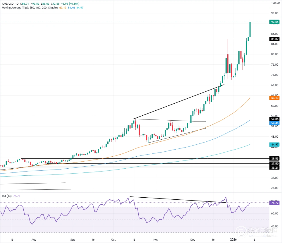 周三,银价大幅上涨,突破了每日低点86.91美元后创下新高,达到93.52美元的历史新高,并且短期内似乎有望突破100美元大关。截至撰写本文时,白银价格为93.05美元,涨幅超7%。