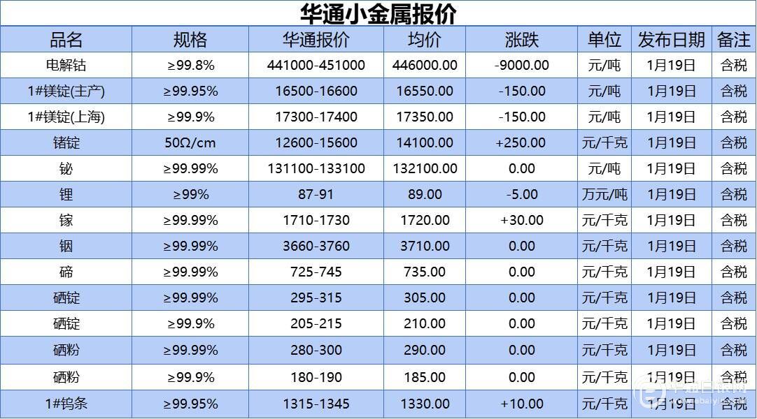 华通白银网 1月19日讯:电解钴、1#镁锭(生产)、1#镁锭(上海)、锗锭、铋、锂、镓、铟、碲、硒锭(99.99%)、硒锭(99.9%)、硒粉、硒粉(99.9%)、1#钨条报价