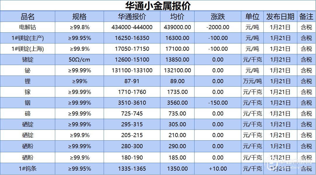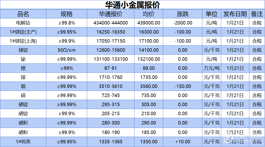 华通白银网 1月21日讯:电解钴、1#镁锭(生产)、1#镁锭(上海)、锗锭、铋、锂、镓、铟、碲、硒锭(99.99%)、硒锭(99.9%)、硒粉、硒粉(99.9%)、1#钨条报价