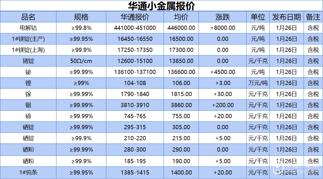 华通白银网 1月26日讯:电解钴、1#镁锭(生产)、1#镁锭(上海)、锗锭、铋、锂、镓、铟、碲、硒锭(99.99%)、硒锭(99.9%)、硒粉、硒粉(99.9%)、1#钨条报价