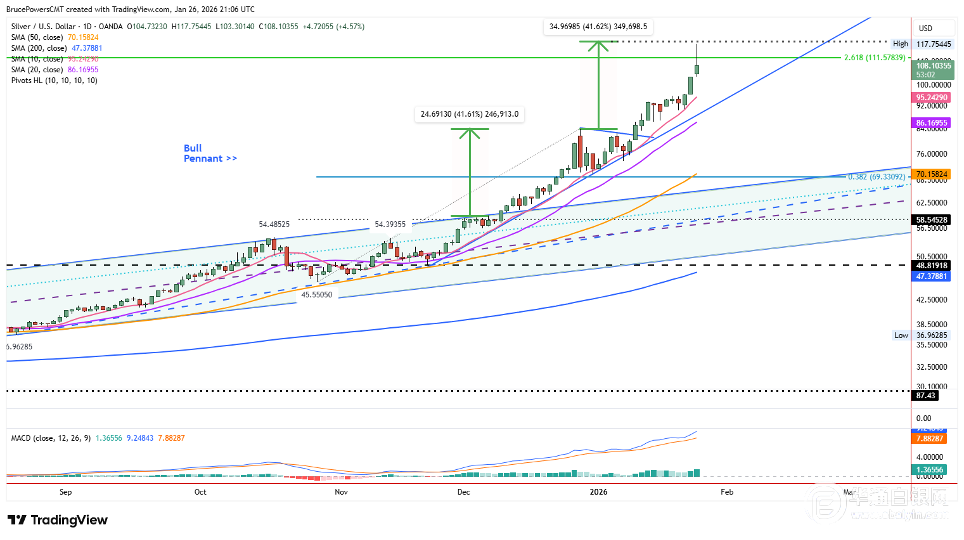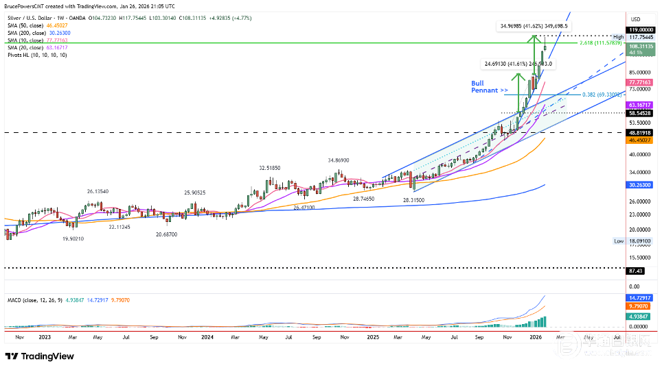 现货白银价格周一冲高回落,盘中一度创下117.75美元/盎司的历史新高后转跌。此轮上涨行情中,银价已突破261.8%斐波那契扩展目标位,随后卖方力量在接近119美元的测量性移动目标位附近显现。该测量性移动通过百分比计算,以当前关键突破后的上涨幅度与前期升势幅度相匹配为判定标准。